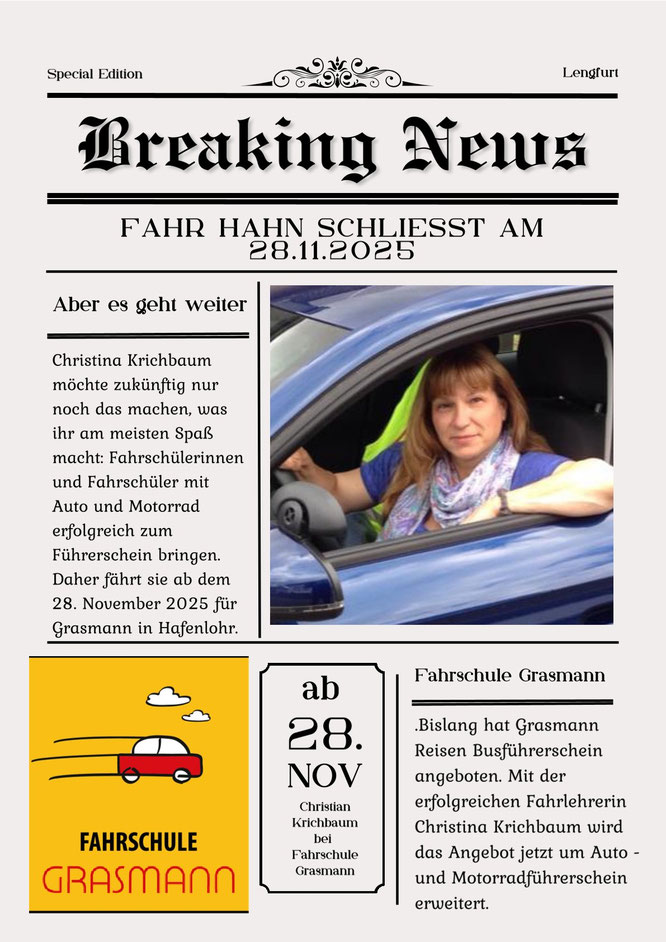 nach vielen Jahren als Inhaberin der Fahr-Hahn Schule habe ich mich entschlossen, mich nur noch als Fahrlehrerin zu betätigen. Das macht mir einfach viel mehr Spaß, mit den Fahrschülerinnen und Fahrschülern zusammenzuarbeiten als die ganzen administrativen und bürokratischen Arbeiten einer eigenen Fahrschule. Ich fahre und unterrichte ab dem 28. November 2025 bei der Fahrschule Grasmann, welche bislang als Busreiseunternehmen auch Busfahrschule anbieten. Mit mir sind dort dann auch Auto - und Motorradführerscheine möglich.